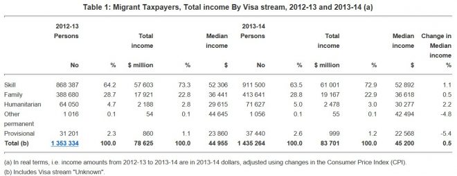 Dr Song’s claim that skilled migrants earn more than your typical Australian is superficially correct, and confirmed by the ABS’ Personal Income of Migrants, Australia, 2013-14, which revealed that permanent migrants reported higher average incomes ($48,400) than the median employee income for all Australian taxpayers ($45,700):